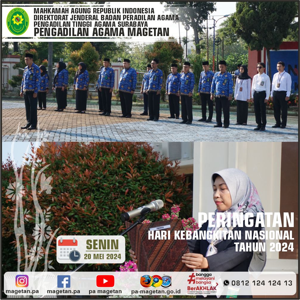 Magetan | pa-magetan.go.id | Seluruh Aparatur Pengadilan Agama Magetan mengikuti upacara memperingati Hari Kebangkitan Nasional (Harkitnas) ke-116 Tahun 2024 di halaman depan kantor Pengadilan Agama Magetan. Kegiatan ini sebagai tindak lanjut dari surat Sekretaris Mahkamah Agung nomor 2936/SEK/HM3.1.1/V/2024 tanggal 18 Mei 2024 tentang Peringatan Hari Kebangkitan Nasional (Harkitnas) ke-116 Tahun 2024. Dengan mengenakan pakaian Korpri, upacara diikuti dengan hikmad oleh seluruh peserta upacara. Pada upacara kali ini diinspekturi oleh Wakil Ketua Pengadilan Agama Magetan (Ibu Wakhidah, S.H., S.HI., M.H.). Peringatan Hari Kebangkitan Nasional (Harkitnas) ke-116 Tahun 2024 kali ini mengusung tema “Bangkit untuk Indonesia Emas”