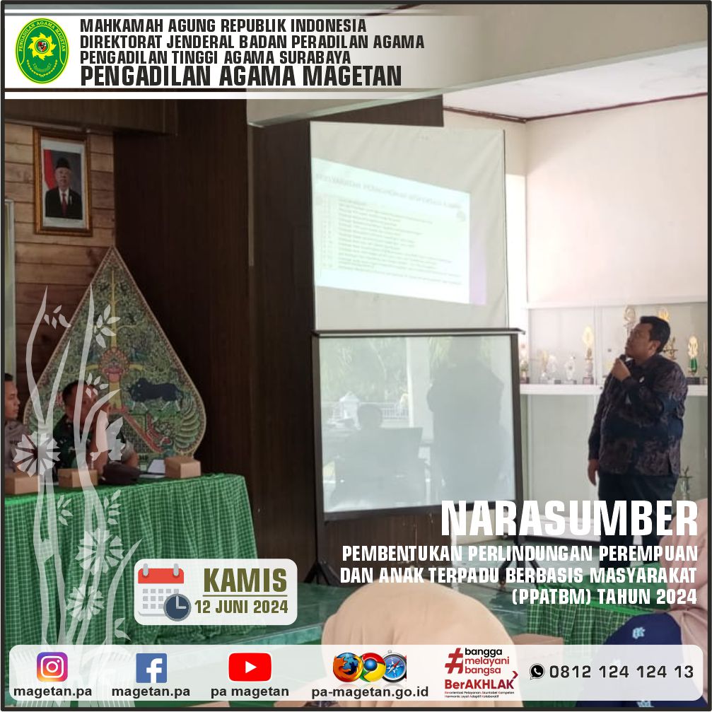 Magetan | pa-magetan.go.id | Pengadilan Agama Magetan yang diwakili oleh Panitera (As'ari. S.H) menjadi narasumber dalam acara Pencegahan Pernikahan Anak bagi Tokoh Masyarakat Desa/Keluarahan dalam Upaya Menekan Pemohon Dispensasi Kawin di Kabupaten Magetan. Kegiatan ini diselenggarakan di Pendopo Kecamatan Kartoharjo.