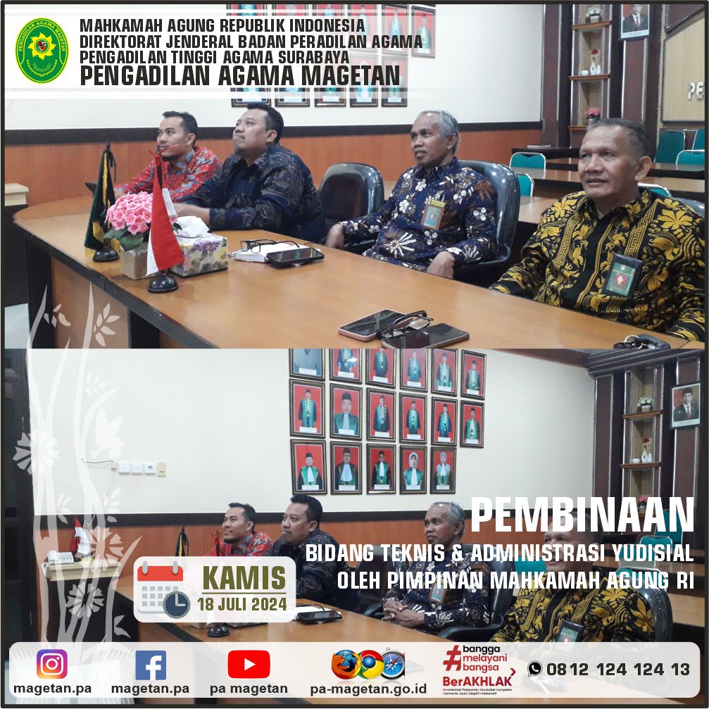 Magetan | pa-magetan.go.id | Ketua Pengadilan Agama Magetan yang didampingi oleh Panitera, Sekretaris dan Para Hakim mengikuti Pembinaan Teknis dan Administrasi Yudisial Oleh Pimpinan Mahkamah Agung RI secara online dari Media Center Pengadilan Agama Magetan.