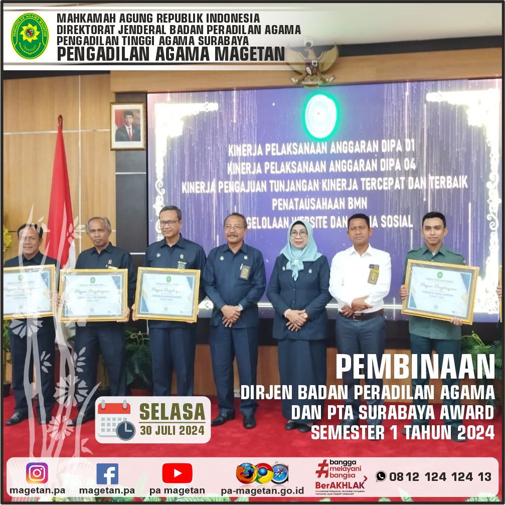 Kegiatan ini sebagai tindak lanjut Undangan PTA Surabaya nomor 3465/KPTA.W13-A/HM3.1.1/VII/2024 tanggal 29 Juli 2024. Pelaksanaan Pembinaan ini diikuti oleh seluruh Hakim Tinggi Pengadilan Tinggi Agama Surabaya, para Ketua, Panitera, dan Sekretaris Pengadilan Agama seWilayah PTA Surabaya, serta pejabat Struktural dan Fungsional PTA Surabaya. Pembinaan Direktur Jenderal Badan Peradilan Agama dan PTA Surabaya Award kali ini mengambil tema "Penguatan Kepemimpinan dalam rangka Peningkatan Kualitas Pelayanan Peradilan di Wilayah Pengadilan Tinggi Agama Surabaya".