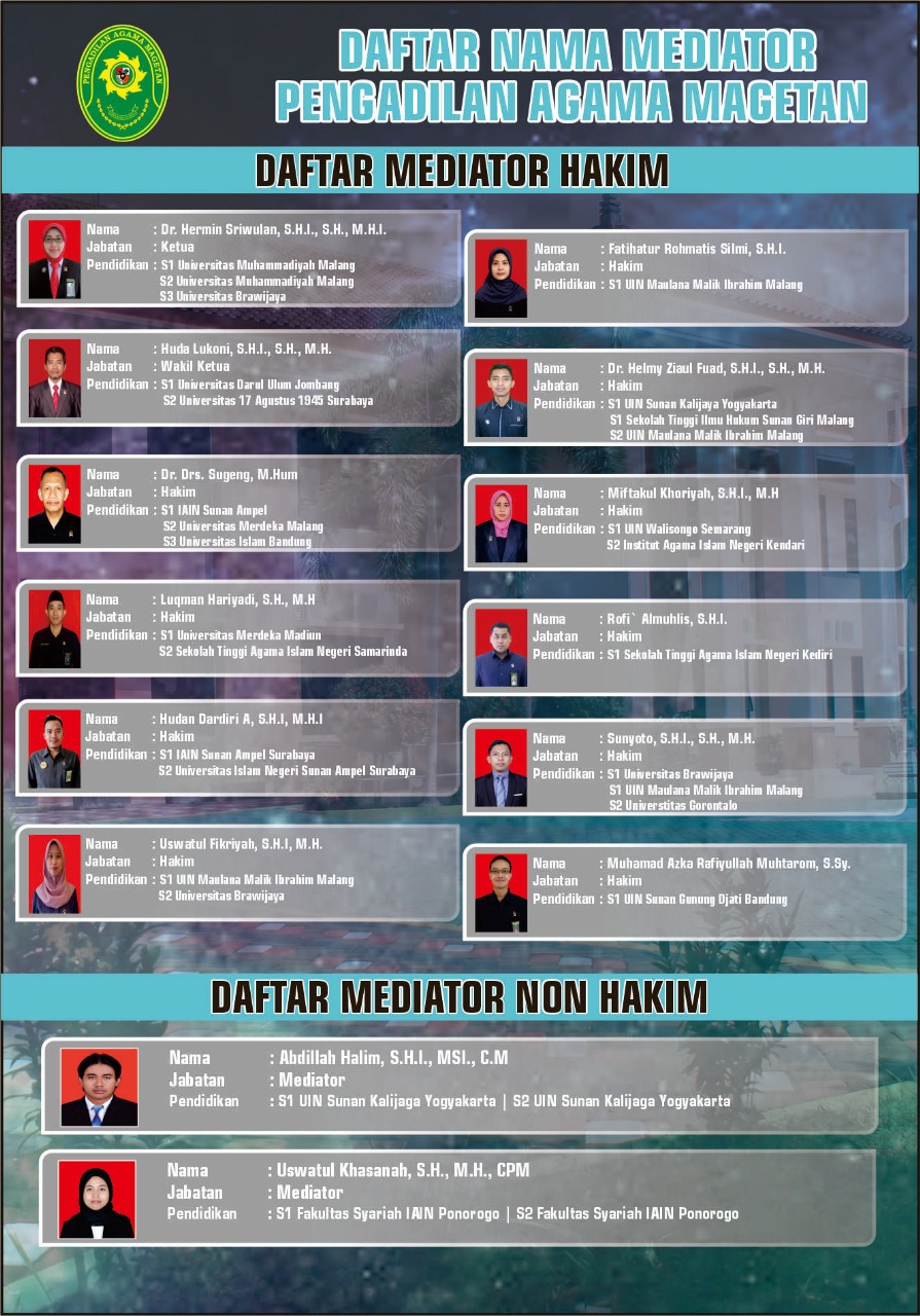 Daftar Nama Mediator Written by Admin on 12 January 2021. Written by Admin on 12 January 2021. Hits: 6001 DAFTAR NAMA MEDIATOR SK MEDIATOR
